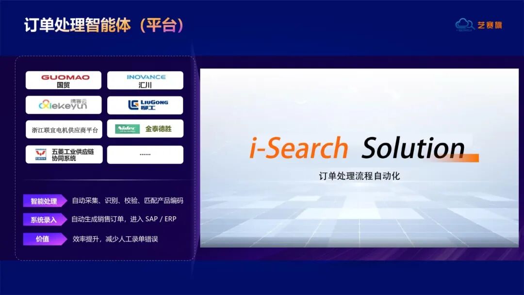 1. 订单处理智能体。 汽车零部件企业通常面临全球订单处理难题——邮件来自不同国家、不同语言、格式不统一,人工处理不仅效率低,还容易出错。艺赛旗订单处理智能体可自动读取全球邮件系统订单,智能提取客户、产品、数量、价格信息,完成数据校验后生成标准销售订单并录入SAP/ERP系统,实现7×24小时全天候响应,让全球订单走向“智能驱动”。