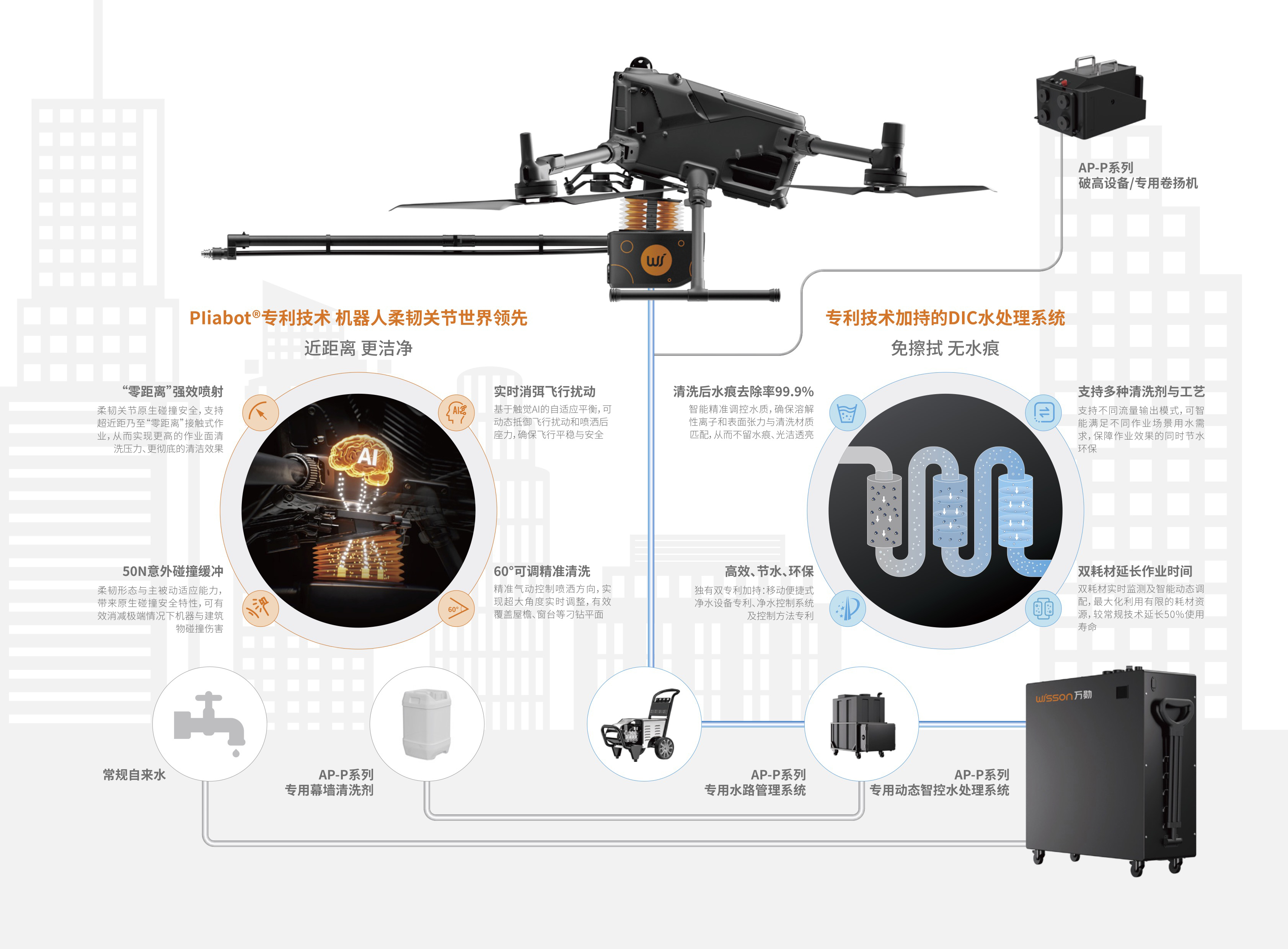 依托独有的Pliabot®柔韧技术与环保工艺,该系统在稳定性、作业效率与场景适配能力上均实现显著提升,更贴合实际应用需求,广泛应用于大厦外墙、高塔等各类高空清洁场景,安全环保,精准强效。特别是AP3-P3空中柔韧系留清洗机器人,可实现AI自适应平衡、柔韧缓冲碰撞及多角度灵活调整,具备原生碰撞安全性能。相较于其他无人机高空清洁方式,AP3-P3可“零距离”抵近作业,最大化作业面清洗压力,搭配AP-P系列专用水路管理系统与专用幕墙环保清洗剂,实现安全、高效的强力清洗。
