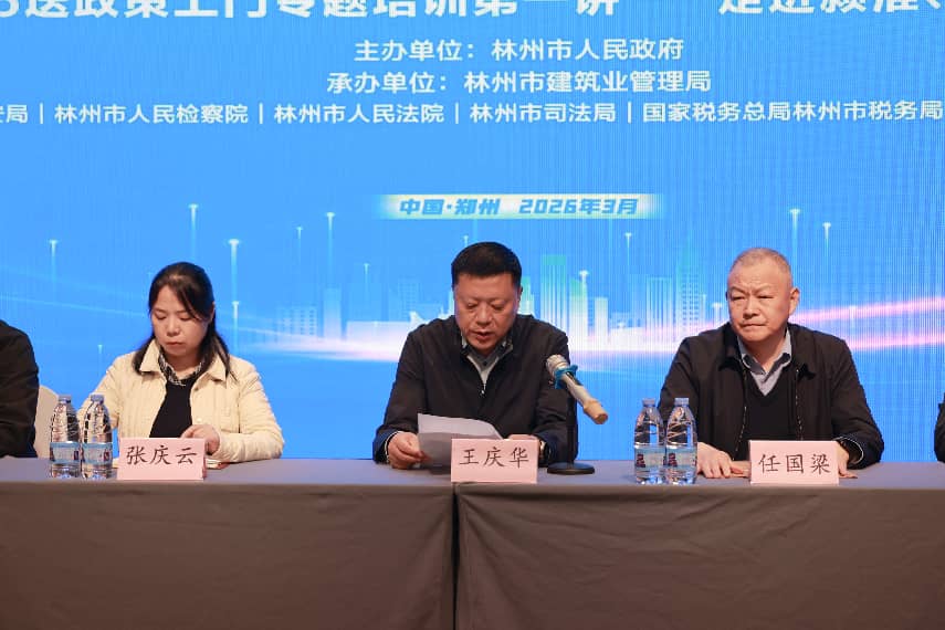在建筑业转型升级迈向高质量发展的关键时期,如何构建法治化营商环境,提升企业风险防控能力,成为行业关注的焦点。2026年3月30日,由林州市人民政府主办,林州市建筑业管理局承办,林州市公安局、人民检察院、人民法院、司法局及国家税务总局林州市税务局多方协办的“建筑业司法保障行动再起航——2026 送政策上门专题培训”活动在郑州举行。本次活动重点走进河南颍淮建工(以下简称“颍淮建工”),旨在通过多部门联动,将最新政策法规送至企业一线,为建筑企业稳健发展注入“法治强心剂”。