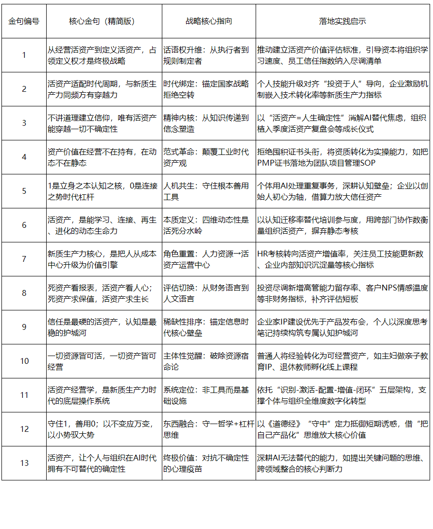这13条金句层层递进、各有指向,既精准界定活资产的本质与边界,又给出个人与组织的实操准则,更锚定其在新质生产力时代的核心价值,成为读懂活资产经营学的关键密钥,具体解析如下: