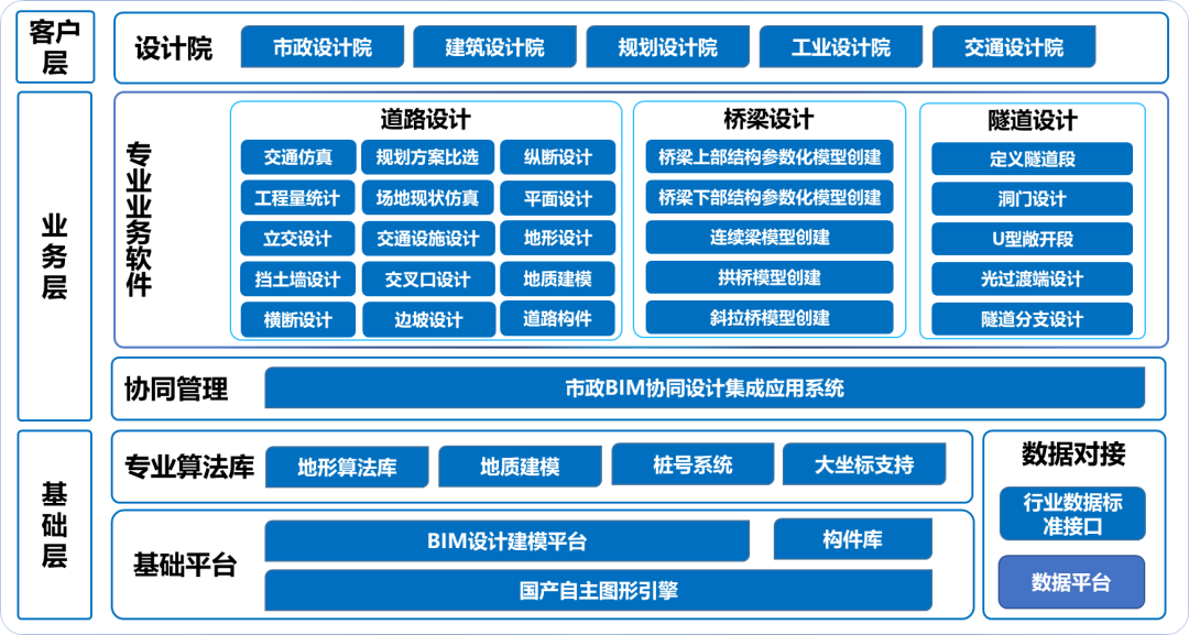 广联达"路桥隧 BIM 设计软件"的开发及推广应用,让中国的路桥隧设计师拥有了真正基于自主可控技术的国产 BIM 专业设计工具,提高了软件产品与国内基础设施设计业务的适配性,保证了基础设施设计数据的安全性,提升了行业设计数据的规范性,为行业数字化转型成功筑牢基础,为智慧城市建设打造数据底座。