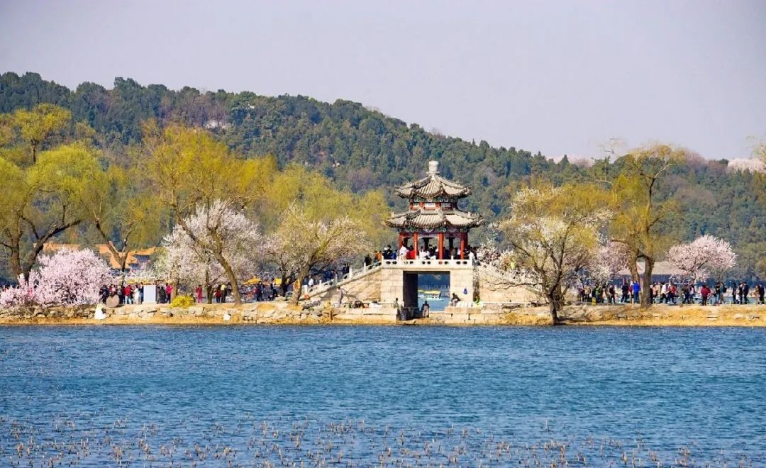 颐和园:昆明湖畔柳芽初绿,西堤山桃与古建筑相映成趣,泛舟湖上可独享皇家园林的春日静谧。