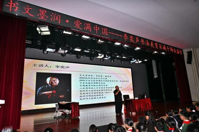 本次李奕声书法美育百城千场公益行走进杭州江南实验学校,既是对国家书法教育政策的精准落实,也是文化公益赋能青少年成长的生动实践。相信随着活动的持续推进,书法美育将在更多校园绽放光彩,让青少年在笔墨浸润中传承文化根脉,以文化自信书写人生华章,为国家培育文化后备人才,绘就文化复兴的崭新图景。