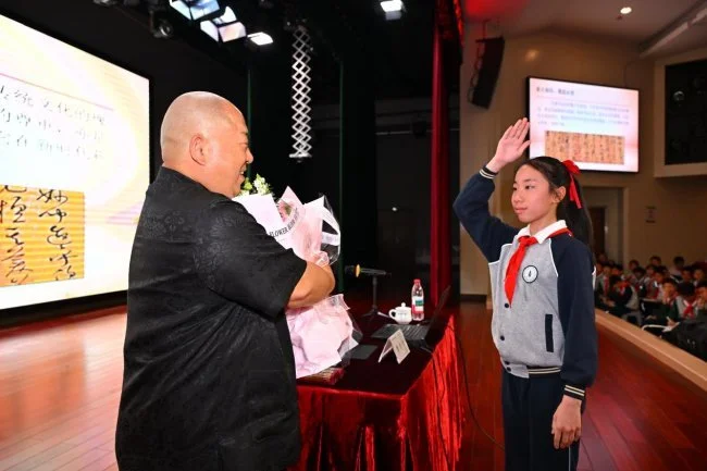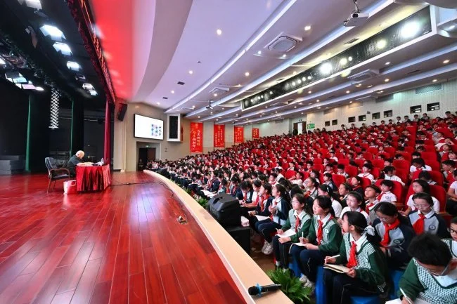 本次活动特邀书法美育百城千场公益行发起人——古文字学家、书法教育家李奕声老师主讲。讲座中,李奕声老师以深厚的书法功底与丰富的教学经验,从古文字起源、书体演变到书法执笔运笔技法,从经典碑帖赏析到书写习惯养成,层层深入为孩子们普及书法知识。他结合青少年认知特点,用生动案例拆解书法背后的文化内涵,引导学生感受汉字“形、神、意”的统一,在笔墨纸砚的交融中提升美育素养,让传统书法的魅力直抵童心。现场师生认真聆听、积极互动,不时爆发出热烈掌声,浓厚的书法氛围充盈整个校园。