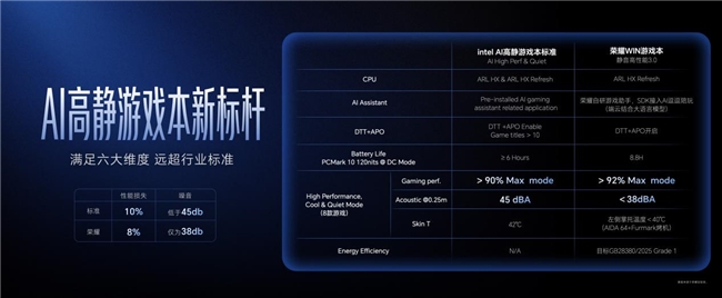 - 荣耀自研静音高性能模式3.0,畅玩3A大作噪音低于38dB,实现狂战性能与图书馆级静音的完美平衡,六大维度超越行业标准,真正做到“高能不吵人”。