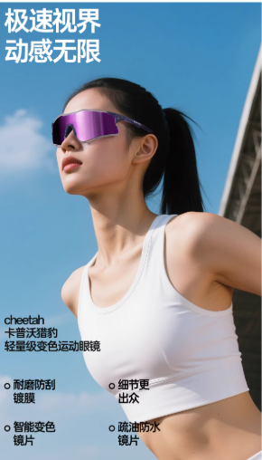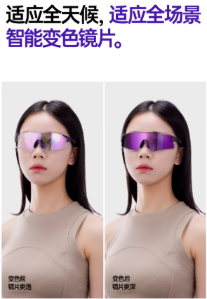 自带智能感光变色功能,强光下自动加深色调,阻隔刺眼阳光与 UV400 紫外线;弱光 / 夜间恢复通透,不影响视野,晨跑、夜跑、阴天、晴天都能用,不用额外换镜,实用性拉满。