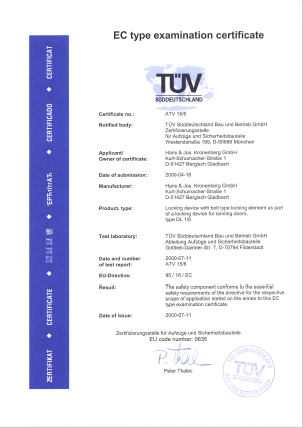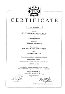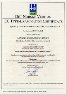 Aritco电梯使用的层门锁定装置(Landing Door Locking Device),分别通过了: