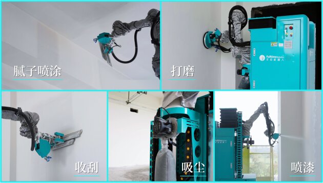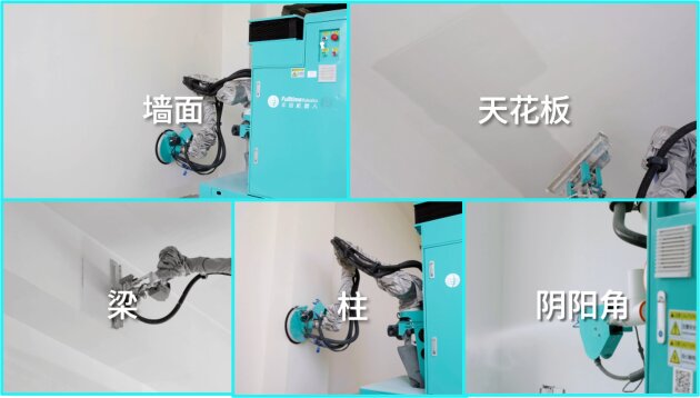 执行器控制力度精度±1N、位置精度0.1mm、速度精度误差率0.5%,腻子收刮平整度稳定在0.5mm以内。多模态集成执行器加执行末端,实现腻子喷涂、收刮、打磨、吸尘、喷漆五大功能;通过标准化接口整合于同一台机器人本体,5min完成快换执行末端;一机多用,相较于行业内采用2-3台独立机器人(如腻子、打磨、喷涂分机)完成多工序的方案,本产品可将客户采购成本降低超2/3,显著优化项目投入产出比。