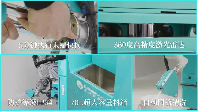 面向建筑工程施工场景的沟、坎、坡、积水、粉尘等复杂工况,产品采用自研四驱全向舵轮设计,越障高度50mm、爬坡能力10°、越沟宽度100mm,防护等级达IP54,可在高粉尘、高污染环境下长时间稳定运行。料箱升级至70L超大容量,按人工上料最舒适高度设计;自动回流清洗功能,让收工清洗时间大幅降低。