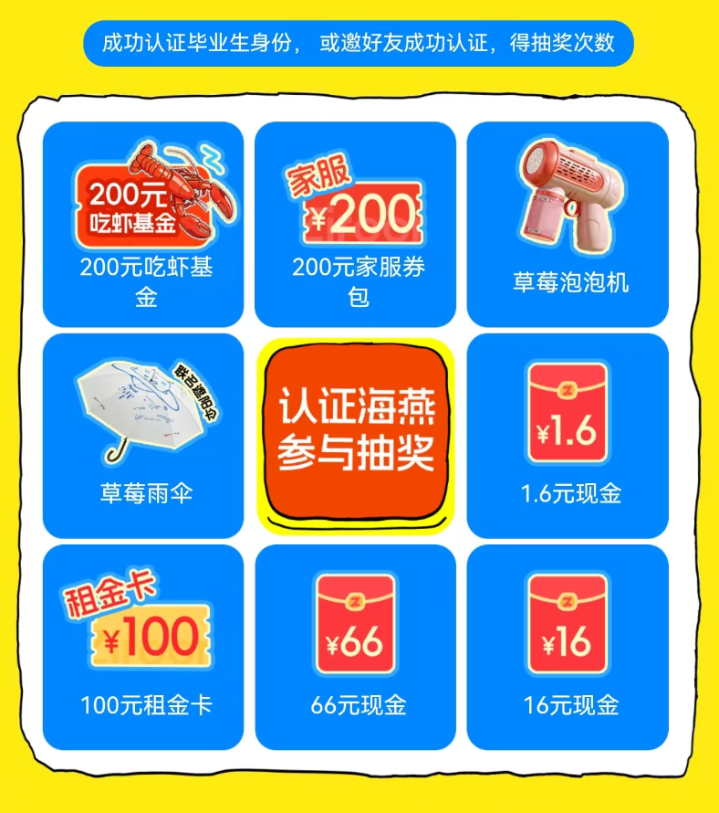 本次活动聚焦毕业生核心需求,参与门槛清晰、福利诚意拉满。2024-2026届国内外高校毕业生,只需在自如APP完成毕业生身份认证,即可参与抽奖,100% 中奖。奖品设置覆盖美食、现金、潮流周边三大类,其中重磅福利为100 份 200 元吃虾基金,让毕业生在武汉春日尽情嘬虾;同时准备了数千份66 元及16元现金红包,直接助力缓解初入职场的经济压力;此外还有草莓音乐节周边礼品等共万份好礼,全方位满足毕业生的生活与娱乐需求。