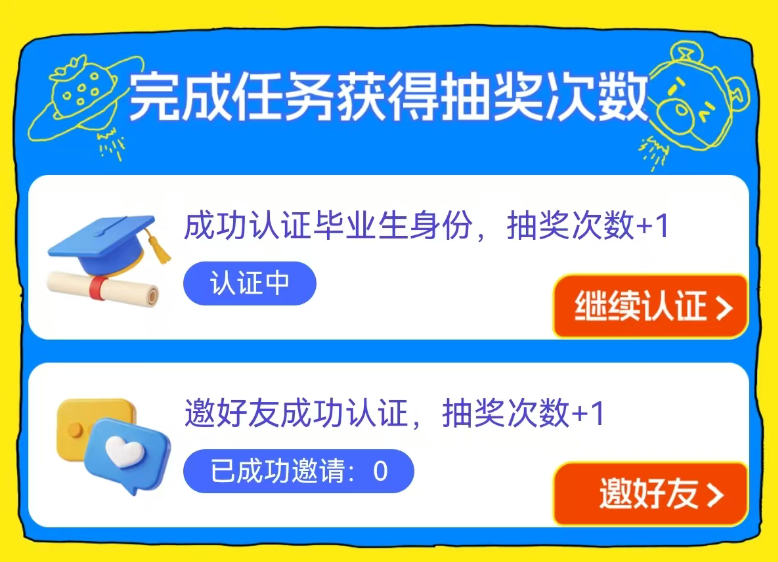 为让更多毕业生共享福利,活动特别设置邀请同学认证机制—— 每成功邀请 2 位 24-26届同学完成毕业生认证,邀请者与被邀请者可各获得1次额外抽奖机会。这一设计既方便毕业生结伴参与、共享好运,也契合年轻人的社交习惯,让毕业季的第一份武汉福利更具温度与互动感。