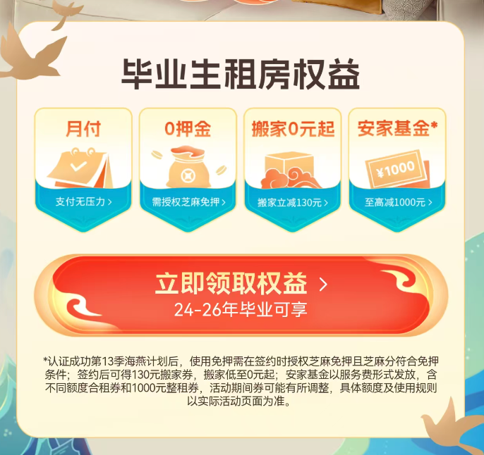自 2011年启动以来,自如海燕计划已连续开展 14 年,累计覆盖超 5000所海内外高校,450 万 + 毕业生享受到专属权益,累计减免押金超13 亿元。作为自如助力毕业生 “安居第一站” 的核心载体,海燕计划始终以 “降低首次租房成本” 为初心,提供房租月付、0 押金、1000 元安家基金、最低 0元搬家等全方位支持,切实减轻毕业生初入社会的居住压力,让年轻人把更多精力投入职业成长。