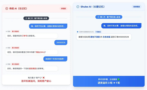 在无记忆模式下,客户发起退货咨询,AI往往需要经过至少3轮追问(确认订单号->确认SKU->确认退货原因)才能进入解决流程。如果在流程中断,下次联系又得全部重来。