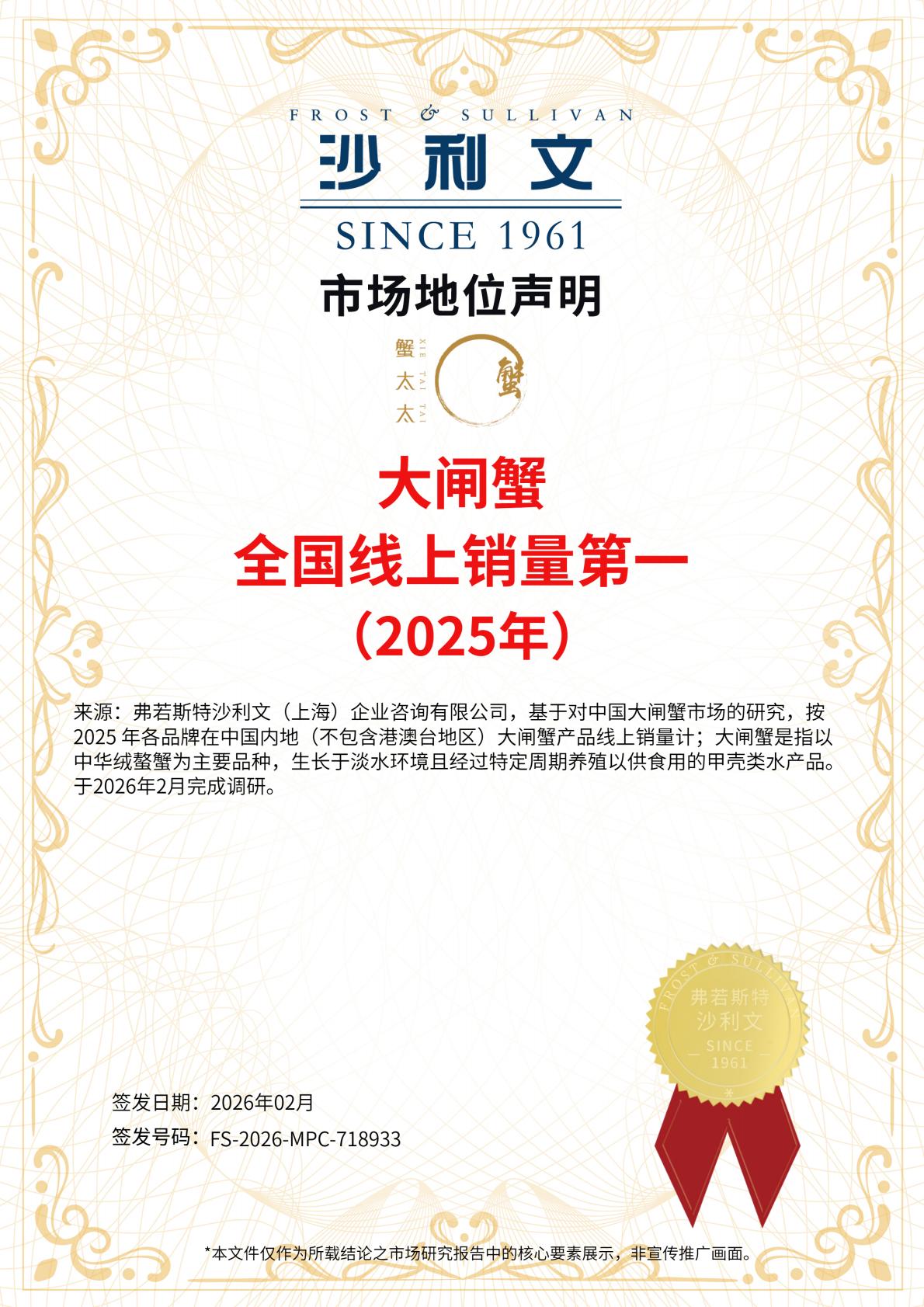 2026年开年蟹太太即斩获好消息,荣获"2025大闸蟹全国线上销量第一"。