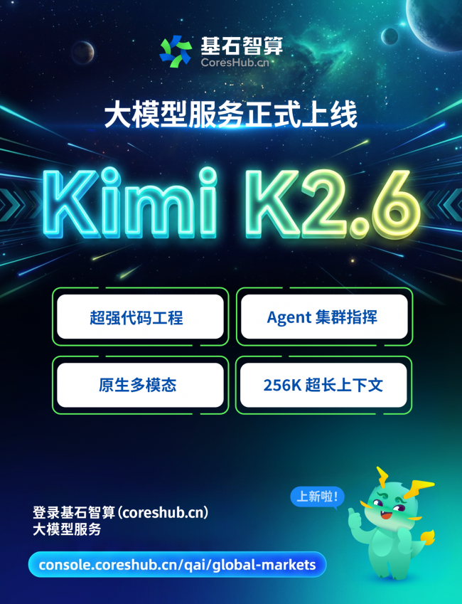 青云科技旗下AI算力云——基石智算CoresHub大模型服务正式上线 Kimi K2.6!Kimi K2.6 重磅登陆基石智算,以顶尖代码能力、大规模 Agent 集群、原生多模态、256K 超长上下文为核心,成为开源 SOTA 新标杆。