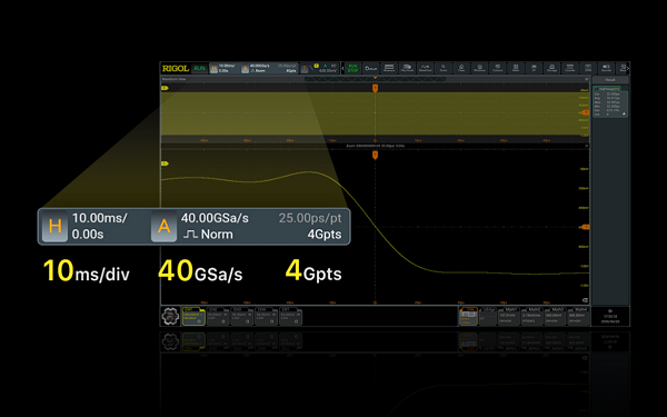DHO50000系列高分辨率数字示波器提供高达4Gpts的超大存储深度,支持100ms时长下40GSa/s的连续记录。搭配1,000,000wfms/s的波形捕获率,无论是复杂的长时序信号,还是低概率出现的偶发异常事件,均能实现精准抓取与全景呈现,真正做到“抓得到、看得全”。