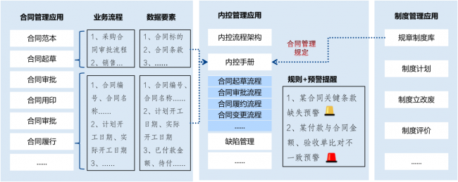 应用体系主要依托内控管理应用中内控手册,在制度管理、合同管理等模块间协同联动,实现内控手册在能够关联规章制度条款的同时,把所有有关合同起草的关键控制点能够实时或定时获取到合同管理应用中数据来进行管控规范【风险/合规验证】,进而严格落实《合同管理规定》要求,实现对合同关键条款缺失、审核流程不合规、合同到期未履约、超权限签约等风险的自动化、智能化识别与闭环防控,提升合同全生命周期合规管控水平。