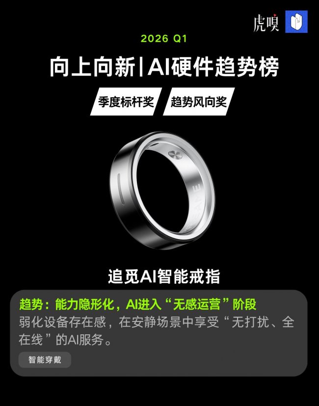 近日,虎嗅网正式发布 “2026 Q1 向上向新|AI 硬件趋势榜” 获奖名单,追觅 AI 智能戒指凭借 “弱化设备存在感,在安静场景中享受无打扰、全在线的 AI 服务” 的核心优势,从众多参评产品中脱颖而出,一举斩获季度标杆奖与趋势风向奖两大重磅荣誉,成为 AI 硬件领域兼具趋势引领力与综合实力的标杆之作。