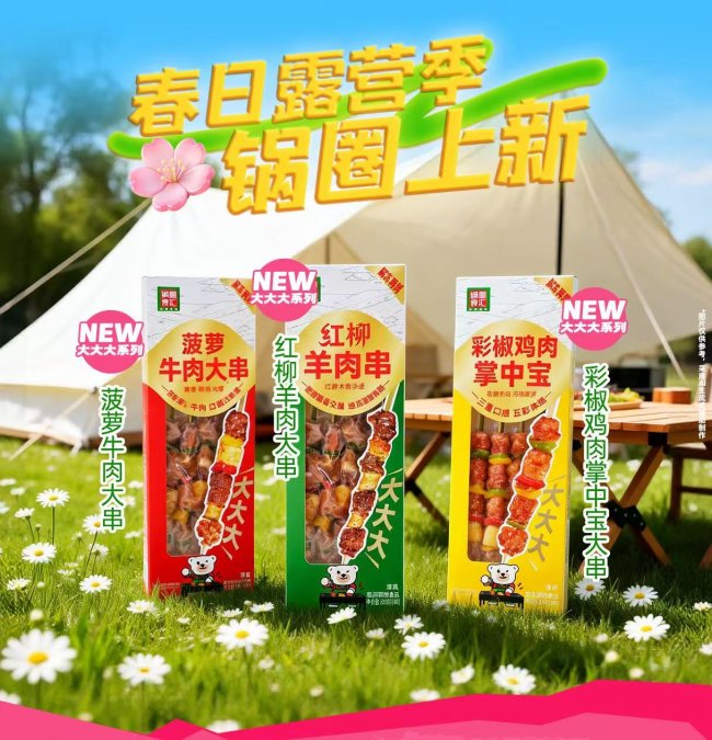 东北烧烤一直以分量足、口味正、氛围感强深受消费者喜爱,锅圈精准抓住这一消费热点,推出东北大大大系列,主打大块实诚肉串,精选优质食材,肉块饱满厚实,搭配东北特色腌制配方,还原地道东北烧烤风味。该系列凭借“量大、味正、便捷”的核心优势,迅速成为烧烤季爆款,尤其受到学生党、年轻上班族的追捧,成为春日解压美食的首选。