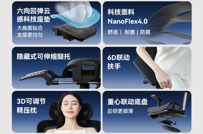 首先,六向回弹云感座垫采用鞍式大曲面和镂空通道设计,均匀分散压力,同时保持透气性,确保长时间坐着依然舒适,避免传统椅子容易带来的压迫感和闷热感。结合NanoFlex4.0科技网布,使得网布更具耐压性和透气性,即使久坐也不会塌陷,保持舒适感。
