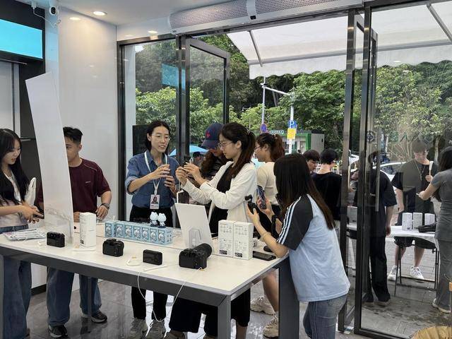 17日下午,在广州大学城的一家人人租线下门店内,迫不及待体验大疆Pocket4的用户们涌入其中,零距离体验这款Vlog神器。他们中有的是想第一时间体验新设备,有的则是为即将到来的“五一”假期出游挑选相机记录。