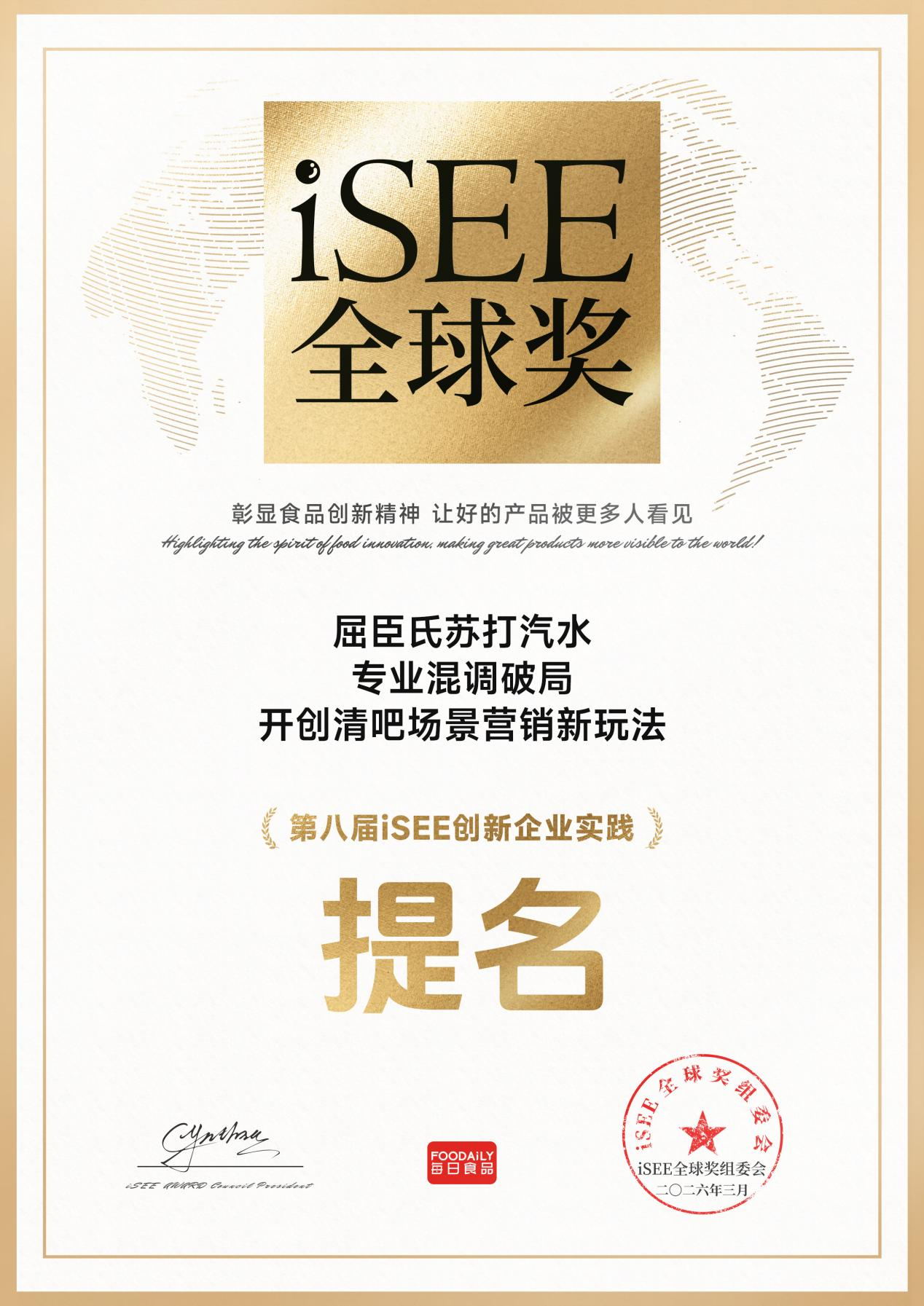2026年4月15日,第八届iSEE全球奖颁奖盛典圆满举办。作为食品行业公认的权威奖项与信任背书,本届iSEE全球奖吸引了来自全球多个国家和地区超过5688个创新案例的激烈角逐。历经长达7个月的系统化评审,最终,屈臣氏苏打汽水“混入咖啡渠道引领场景营销新风向”斩获“卓越商业实践奖”,屈臣氏苏打汽水“专业混调破局开创清吧场景营销新玩法”荣获第八届iSEE创新企业实践提名,成为全场瞩目的焦点。