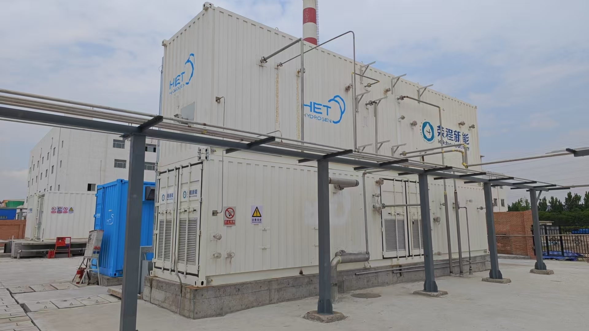 此次安装完成的 HET-A1000 设备,构建了全球首个 “光伏 — AEM 制氢 — 高炉富氢冶炼”全链条集成体系。园区将新建 17MW 建筑光伏一体化(BIPV)系统,并配套2套 5MW(单套1000Nm³/h)AEM 电解制氢系统。制取的绿氢将掺入天然气管道,用于荣程钢铁集团高炉富氢喷吹,实现煤炭减量、碳排放降低的目标,真正推动钢铁厂从传统的 “碳排放大户”转变为“绿色能源枢纽”。