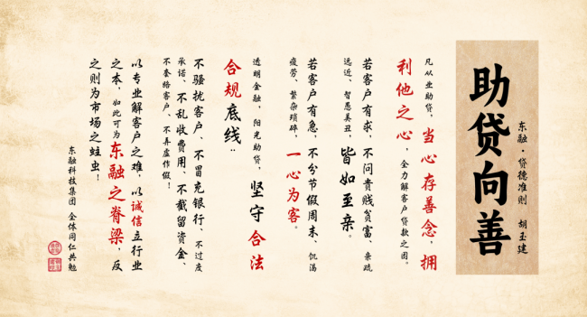“良心做人 匠心助贷”:良心是底色,匠心是能力。“良心做人”是不可动摇的底线——要求每一位东融人在每一次选择面前,始终站在客户一边,不欺、不瞒、不套路。“匠心助贷”是严苛的标准——把每一个方案、每一次沟通做到极致,用专业赢得尊重,用细节守护信任。