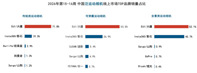 这股强劲势头,也体现在泛运动相机领域。根据洛图科技发布的《中国运动相机线上零售市场周度追踪》报告,2026年第15-16周(2026.04.06-2026.04.19)最新双周,大疆在该领域以66.2%的合计销量份额位居第一,展现了无可争议的领导地位。