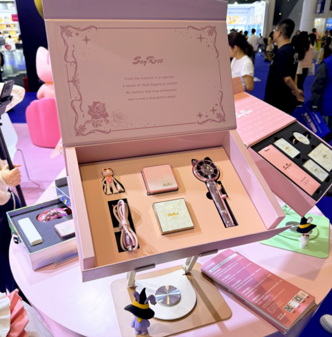 展会现场,SayRose展位接待了大量企业采购代表、礼品渠道商及品牌联名方。此前在香港电子展上,SayRose首次以独立品牌身份面向国际市场,其“女性轻奢3C”定位吸引了欧美、中东、东南亚等地专业买家的关注。几天后,品牌转战深圳礼品展,参展逻辑却发生系统性转变——从单品功能体验转向礼赠场景解决方案。展位延续VIKKY粉色主题设计,但产品陈列调整为“通勤轻礼”“居家陪伴”“出行随享”“办公格调”四大主题礼盒,每套礼盒均配备VIKKY主题包装与定制化空间。这一变化标志着SayRose不再局限于数码配件销售,而是以“科技礼赠”为价值锚点,主动切入礼品市场。