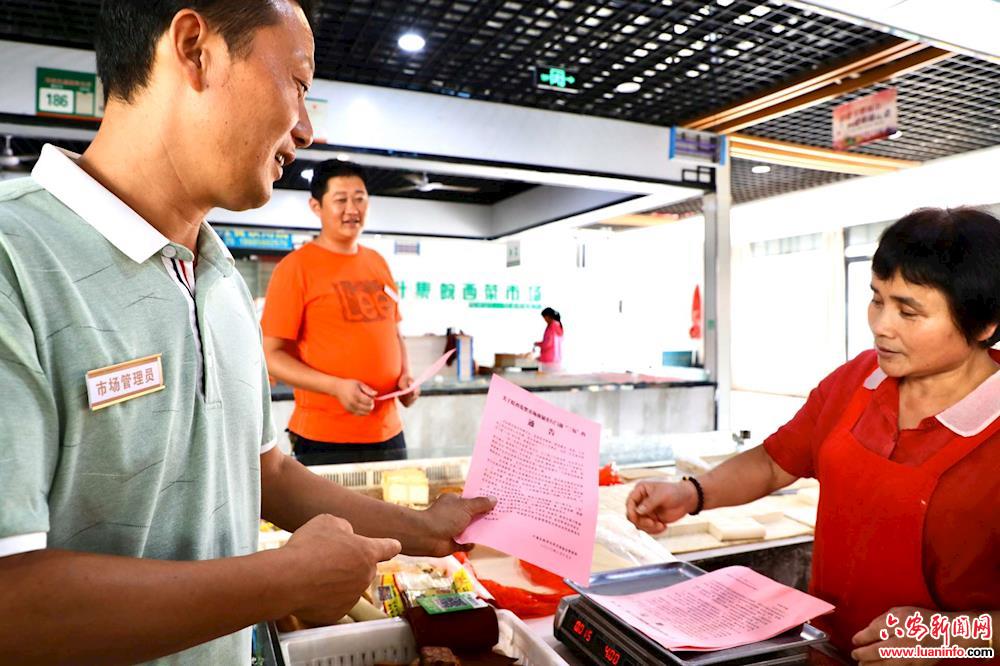 “门前不能有垃圾,禁止乱搭乱建,把自己摊位打理干净,人人出把力,文明创建我们大家一起努力。”9月1日,叶集区皖西农贸市场管理部门的市场管理员台清泉正在向经营商户发放门前“三包”规范经营的明白纸。据了解,从8月开始,皖西农贸市场9个文明管理员统一“戴牌”上岗,规范管理,对市场内的堆放垃圾、乱停车辆、占道经营等不文明行为进行管理,养成大家文明经营的习惯。“市场每天都清扫消毒,管理也很规范,看起来干净、整齐多了,我们买菜也更放心了。”一位来市场买菜的徐女士高兴地说。( 皖西日报融媒体记者 宋金婷 袁洁 文/图)