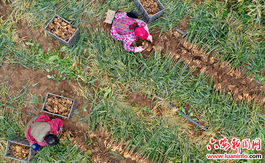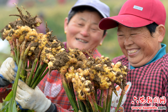 12月5日,裕安区城南镇桃湾村小黄姜扶贫示范基地,村民孙绪琴(右一)和顾家云捧起丰收的黄姜喜笑颜开。裕安区城南镇桃湾村采取"基地+合作社+公司"的模式,统一承包土地、统一购种、统一生产、统一经营的方式,采用有机绿色环保技术,通过科学化、集约化、精细化管理种植食用价值和药用价值较高的小黄姜,发展集体经济,带动贫困户就近就业增收致富,巩固脱贫成果,助力乡村振兴。(皖西日报融媒体记者 田凯平 摄)