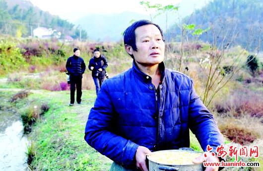 2020年11月30日,刘光福(前)端着鸟食前往湿地投放。张红兵(后左)、胡春雷(后右)背着相机前往拍照记录。