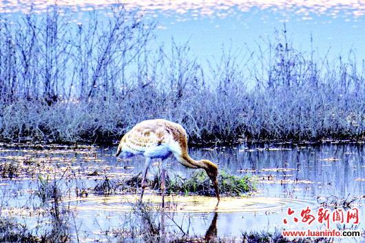 2020年11月30日,落单的幼鹤在霍山县单龙寺镇扫帚河湿地上觅食。