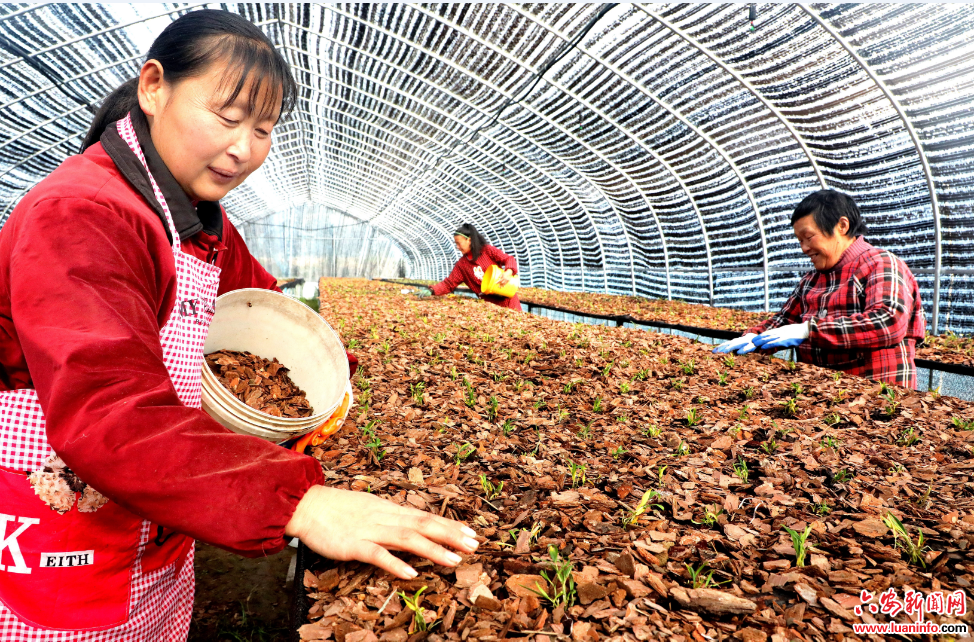 霍山县单龙寺镇扫帚河村百亩石斛产业基地里,康兰等几名村民正在为石斛苗铺盖树皮增加温度。