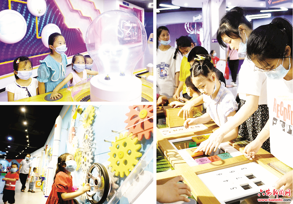 7月11日,小朋友在六安市科技馆里体验科普展品。(左下)