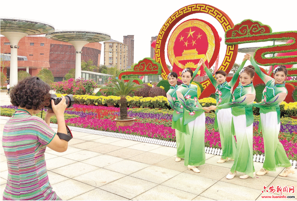 9月27日,城区市民广场,市民在国徽绿雕造型前游览、拍照留影。国庆将至,为增添佳节祥和气氛,我市园林绿化部门用一串红、矮牵牛、万寿菊等花卉绿植,布置成立体绿雕和喜庆图案,营造浓厚节庆氛围。六安城区处处五彩缤纷,充满生机,洋溢着一片祥和、喜庆欢乐的节日氛围。(皖西日报融媒体记者 田凯平 摄)