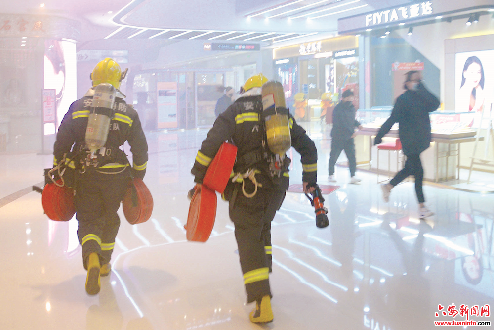 11月9日,城区万达广场一号门大厅里,浓烟弥漫、警报声声,百余名商户工作人员在安全员的引导下,弯腰捂口鼻紧急疏散,有序撤离至安全区域……当日是全国消防安全宣传教育日,金安区消防救援大队、市特警支队、六安万达广场商业管理有限公司联合在城区万达广场进行消防疏散和暴恐防范实战演练,现场通过模拟火场疏散逃生、消防器材使用、云梯高空救人、反恐防暴处突实战演练等方式,进一步增强全民消防安全和暴恐防范意识,提高预防和抵御各种安全风险能力,营造和谐稳定的社会环境。图为警报声声,“逆行者”快速到达“火场”救援。(皖西日报融媒体记者 田凯平 摄)