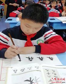 看,书法班的孩子们,一年级老师手把手教孩子写生字,高年级学生一笔一划精心书写,一份份娟秀工整的作品应运而生。