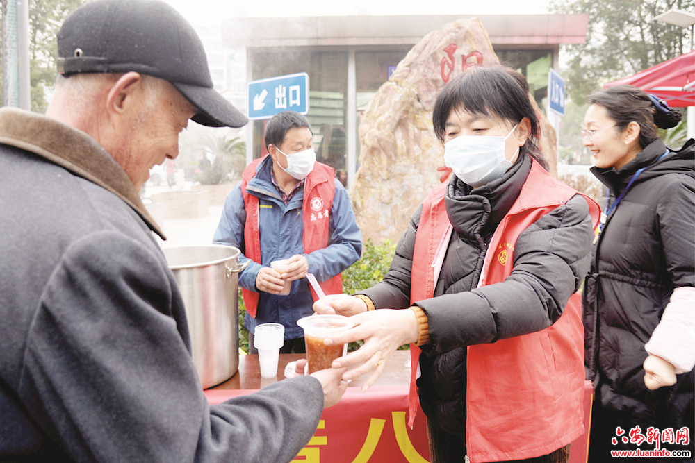 图为1月10日早晨,金安区三里桥街道阳光社区志愿者们将熬制的爱心腊八粥送到辖区居民和环卫工人等户外劳动者的手中,传递温暖和关爱之情。(皖西日报融媒体记者 田凯平 摄)