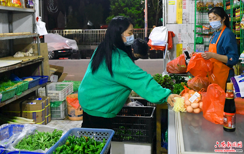 4月4日晚,金安区望城街道东苑小区的居民在小区门店购买蔬菜。