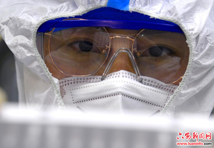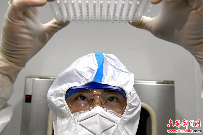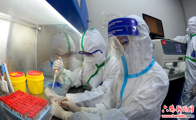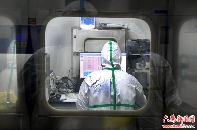 4月5日,六安市中医院分子生物学实验室的检测人员在加班工作。