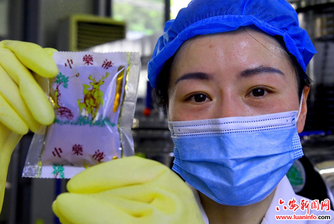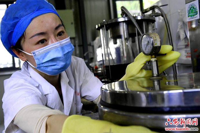 4月5日,六安市中医院的药师在展示煎制的新冠预防药液。