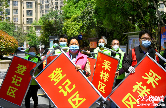 4月5日,六安市爱心妈妈公益协会的志愿者和社区工作人员在放置核酸监测点指示牌,准备开展第二轮核酸检测。