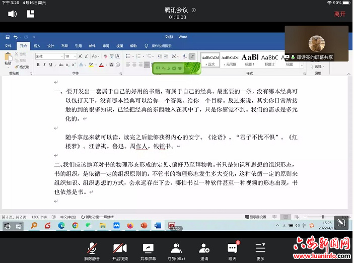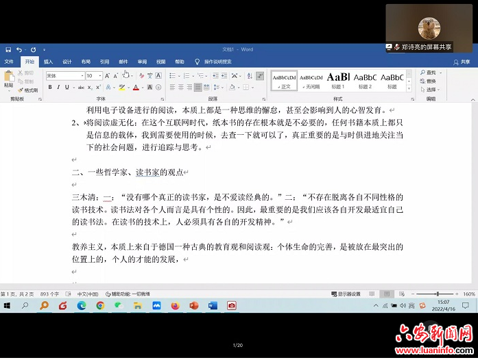古人云:书犹药也,善读之可以医愚。阅读是传承人类文明的重要手段,在大学生的发展当中,阅读具有非常重要的作用。互联网时代信息技术的不断发展,促进了大学生阅读内容和阅读形式的多元化。为让同学们进一步了解在互联网时代,应该怎样读书、读书的意义何在,2022年4月16日下午,应法学院邀请,著名书评人、《澎湃新闻·上海书评》执行主编、复旦大学辩论队执行教练、JustPod旗下播客“午后偏见”主播郑诗亮做客皖西学院“政法周末大讲堂”第162期,以“互联网时代的阅读与批判性思考”为主题作报告。法学院近300名师生在线聆听了报告,法学院院长刘鑫主持报告并作总结。