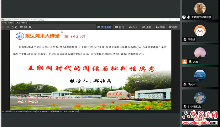 《澎湃新闻•上海书评》执行主编郑诗亮做客皖西学院“政法周末大讲堂”谈互联网时代的阅读