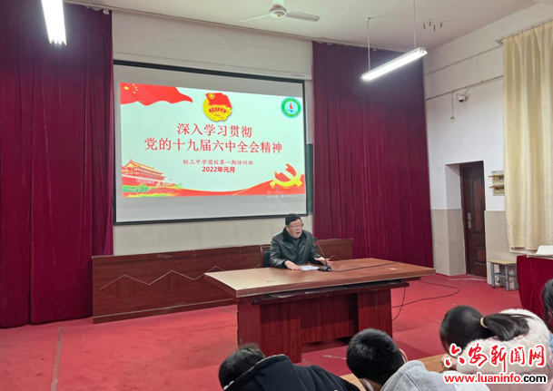 2022年元月4日下午,第一堂团课在雄壮的国歌声中拉开帷幕,校党总支王帮发书记带领入团积极分子深入学习贯彻党的十九届六中全会精神。