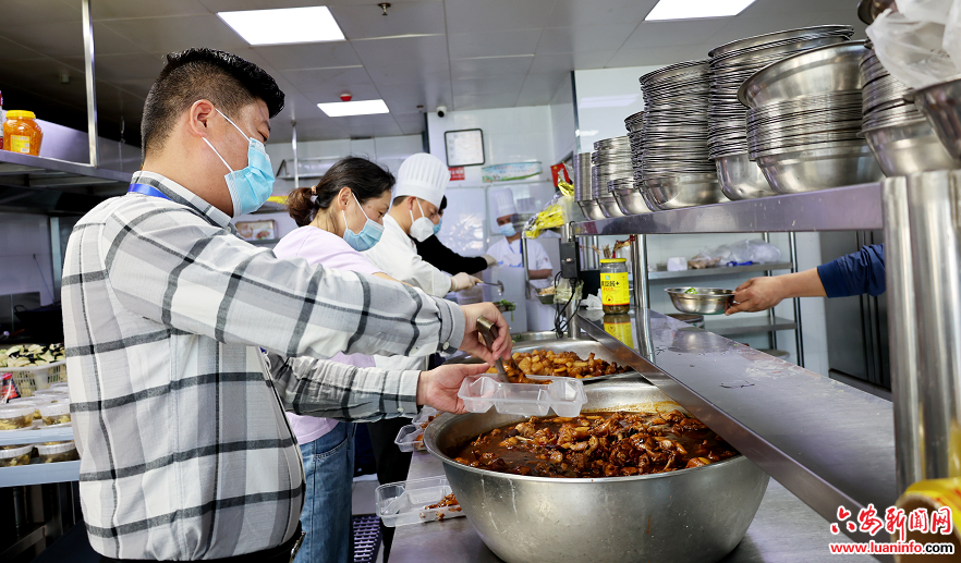 4月22日上午,霍邱县云朵时尚餐厅干净整洁的后厨里,饭菜飘香,操作台上几大盆刚出锅的土豆红烧肉、红烧鸡腿、清炒时蔬、紫菜蛋汤等还冒着热腾腾的蒸汽,餐厅经理刘树威正带着十几名员工将饭菜打包、装盒、贴安心封口标签,一系列流程忙而不乱、紧张有序……