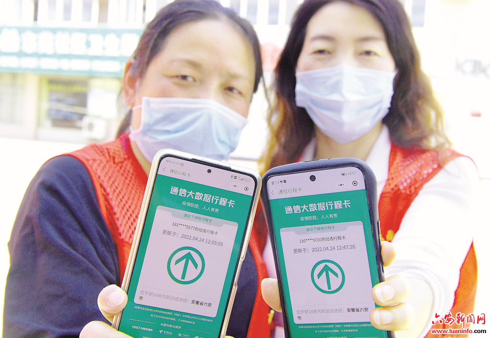 4月24日,金安区望城街道东苑小区值守的两名志愿者在展示“摘星”后的手机行程码。
