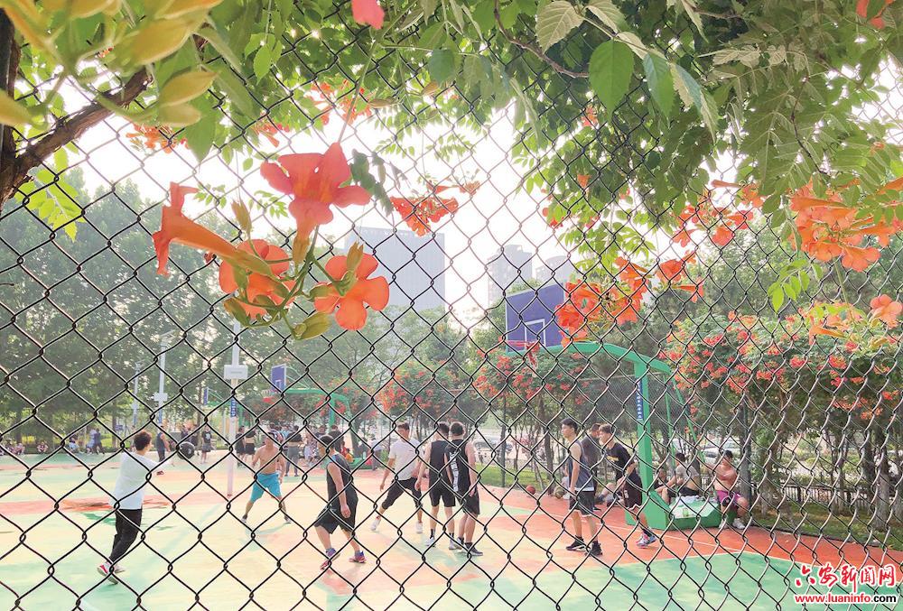 6月5日,六安城区中央公园篮球场,一簇簇橘红色凌霄花攀爬在护栏上随风轻舞,一根根花枝垂坠,婀娜多姿,灿若云霞,散发出阵阵幽香,绿树、红花交相辉映,让健身场更加生机勃勃、活力无限,被市民誉为“最美篮球场”,成为公园里一道别样的亮丽风景。(皖西日报融媒体记者 田凯平 摄)